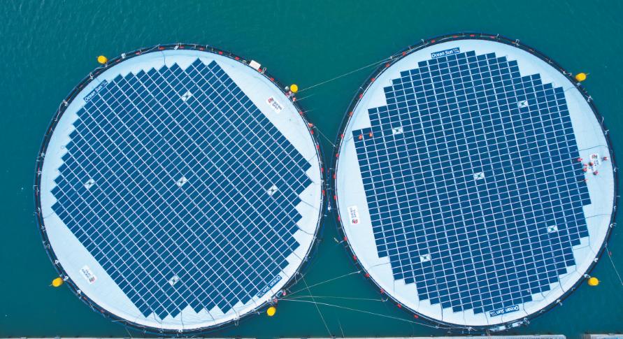 該項目位于山東省煙臺市海陽市南側海域,離岸30千米,水深30米。本次建設的500千瓦漂浮式海上光伏由兩個環形浮體單元組成,在直徑53米,面積相當于4個標準籃球場的浮體單元上,共安裝了770塊光伏組件。該項目驗證了浮體、錨固、發電組件抗風浪能力以及風光同場并網的技術可行性。